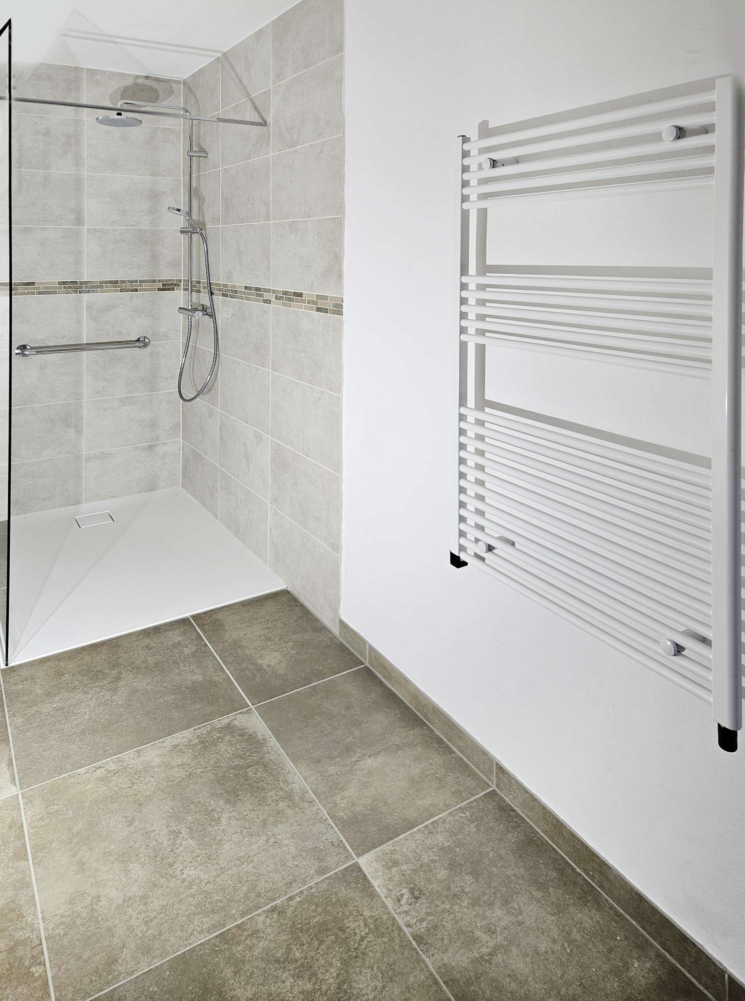 Um eine Grundwärme im Bad zu erzeugen, verlegten wir nach dem Abdichten eine elektrische Heizmatte auf nahezu dem gesamten Boden. Auch hier kamen Sockelfliesen als Wischkante zum Einsatz. In der Dusche wurden die Wandfliessen mit einer Bordüre aufgelockert.