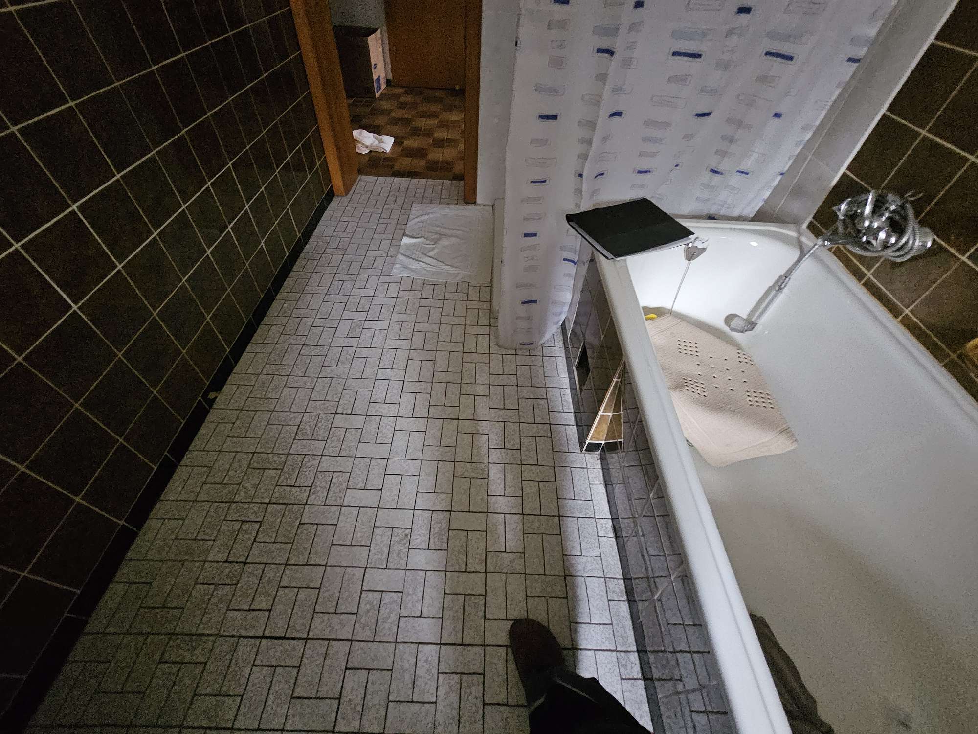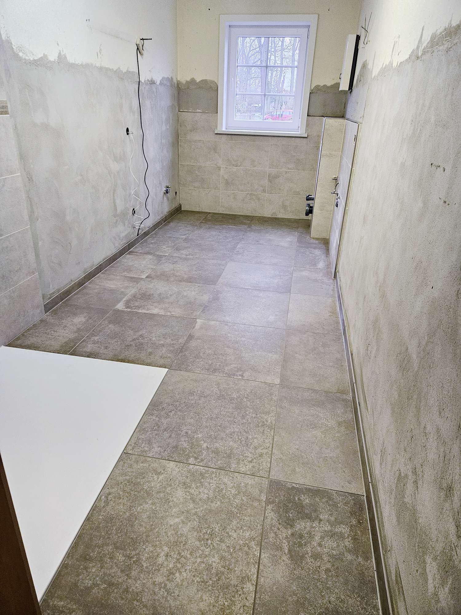 Ein altersgerechter Badumbau. Hier haben wir den kompletten Rückbau vorgenommen, die Aussparung für die Dusche vergößert und das Loch von der Badewanne geschlossen. Die Wände wurden dort nachgeputzt wo ursprünglich der alte Fliesenbelag war. Die Mineralgusswanne wurde vertieft montiert.